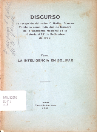 La inteligencia en Bolívar : discurso de recepción del Señor Rufino Blanco Fombona como individuo de número de la Academia Nacional de la Historia, el 27 de septiembre de 1939.