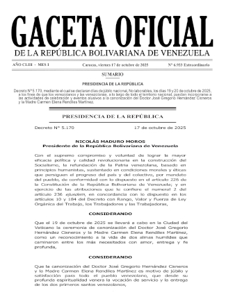 Gaceta Recurso contínuo Gaceta Oficial de la República de Venezuela año CLIII – Mes I, Caracas 17 de Octubre de 2025 N° 6.933 Extraordinario noviembre 19, 2025 Massiel Pirela Canonización, Dr. José Gregorio Hernández 1864-1919, Madre Carmen Elena Rendiles Martínez Leer más