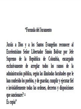 Título: [Fórmula de juramento para reconocer al Excelentísimo Libertador Simón Bolívar como Jefe Supremo de la República de Colombia] Transcripción