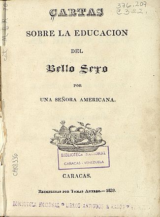 Cartas sobre la Educación del Bello Sexo por una Señora Americana, Caracas, Tomás Antero, 1833, 203P.